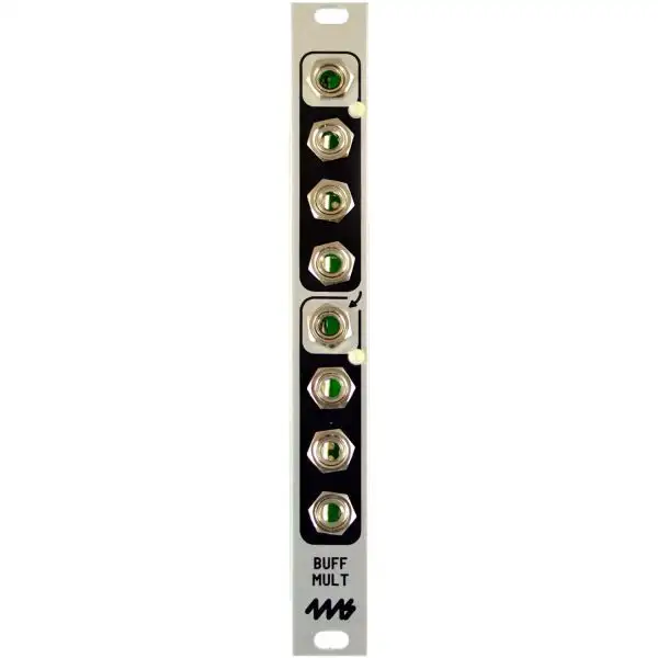 The 4ms Buff Mult is a buffered multiple with LED indicators to show positive and negative voltages. Using wide bandwidth opamps, it functions as a dual 1-to-3 or a single 1-to-6 mult for audio, video, or CV signals.