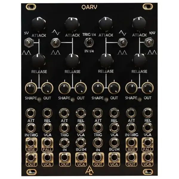 The After Later Audio QARV features four channels of function generator, oscillator, slew limiter, envelope, and VCAs. This module brings the ultimate in flexibility as it can be used as a standalone synth voice, a massive amount of modulation, or a four channel envelope generator with mixer. We believe this makes QARV a great first module and a great addition to the largest of systems.