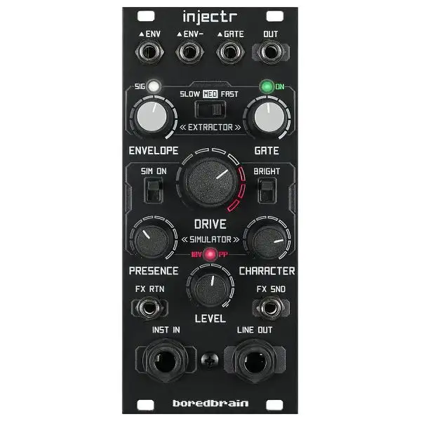 The Boredbrain Injectr is a fully-equipped electric guitar and bass interface for eurorack synthesizers. The module features an overdrive-capable preamp, versatile amp simulator, and control voltage extractors designed to inject stringed instrument signals directly into the modular environment.