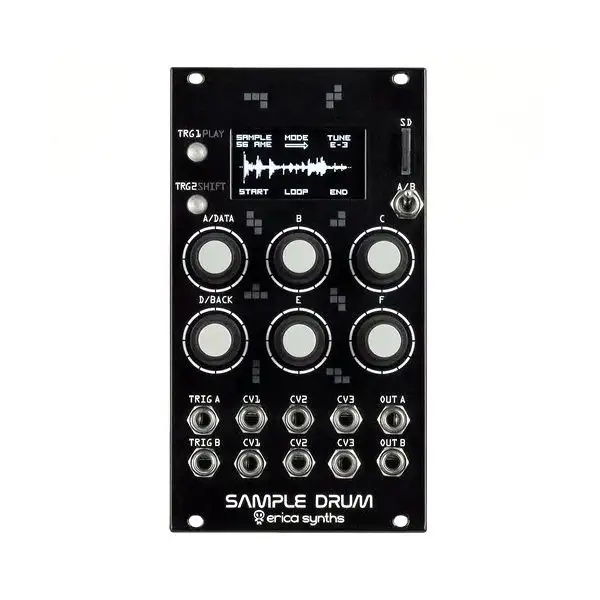The Erica Synths Sample Drum is a 14HP Eurorack sample player/sampler module with straight-forward, intuitive interface, functionality and great sound quality, designed with live performance use in mind.