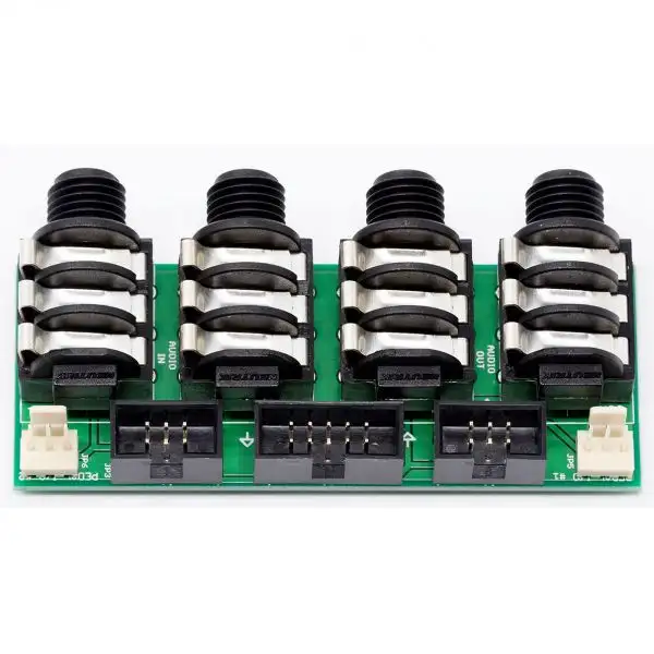 The board holds four Neutrik TRS jacks, each of which can be configured as either an input or an output depending on the modules you connect. This allows you maximum flexibility when configuring your case — whether you wish to use the audio jacks as outputs, inputs, sends & returns; or some combination of these.