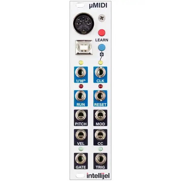The Intellijel uMIDI provides all the essentials to control and sync your Eurorack modular from your computer, iPhone/iPad, or hardware MIDI device with a minimum of fuss. No menu diving or configuration scripts, just two buttons. The connectivity, feature set, and compact size make the ยตMIDI ideal for integrating your modular with the rest of your rig while not taking up too much space in your case.