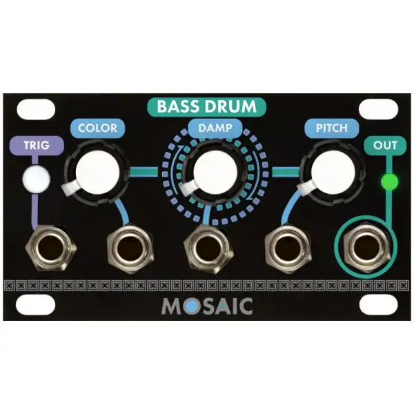 Bring the boom with the Mosaic Bass Drum 1U. Bass Drum is a dedicated kick voice, and an essential piece of any percussive section. With v/oct tracking, Bass Drum can play the role of both rhythm and melody, rounding out the low end of your patch. With control over character and dampening, your kicks can shake the house, or sit in the pocket.