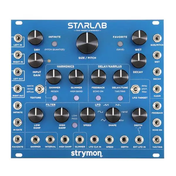 Expand the sound of your modular rack with incredibly lush, ethereal reverbs. Enhance signals with gorgeous chorus, flanging, and modulated delays. Create uniquely expressive synth voices with Karplus-Strong string synthesis. Turn simple mono audio signals into vast stereo soundscapes. The Strymon StarLab Time-Warped Reverberator is a single Eurorack module that will completely transform your modular rack.