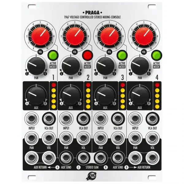 The xXaoc Devices Praga is an expandable four-channel voltage controlled mixer featuring a stereo mixing bus, two auxiliary sends with stereo returns, clickless muting, dedicated modes for unipolar and bipolar voltage control over volume, DC-coupling, and a super-clean signal path obtained via high-quality VCA and opamp chips.